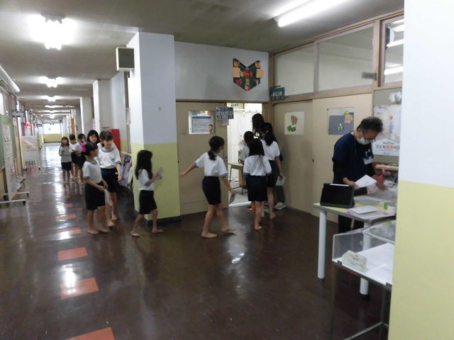 4年生は心臓検診がありました。子どもたちは、図書室前に集まり静かに説明を聞いています。