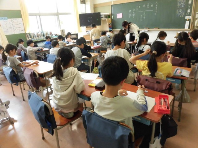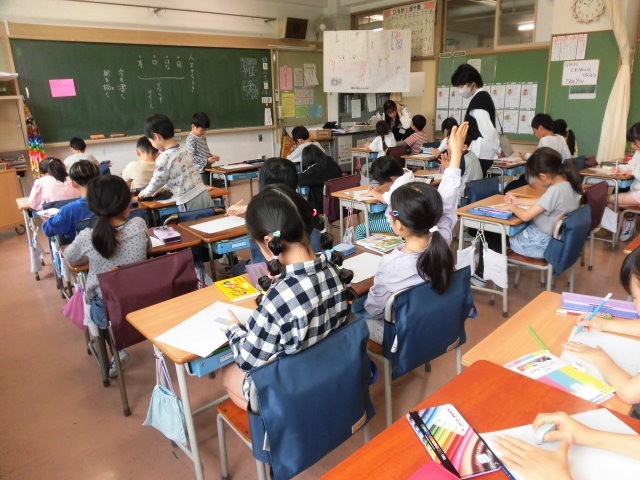 2年生の子どもたちは運動会の一場面の絵を描いていました。どの場面にしようか悩んでいる人もいます。描くことを決め、どんどん描き始めている人もいます。