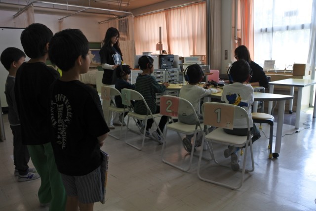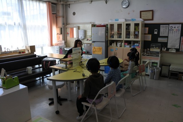 子どもたちはヘッドフォンを付けて静かに座っています。音がなったらボタンなどを押して知らせています。