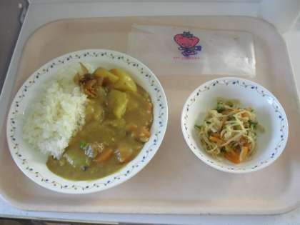 カレーライス 牛乳 福神漬 切り干し大根のサラダ お楽しみデザート
