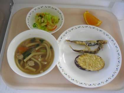 煮込みうどん 牛乳 天ぷら キャベツの塩昆布かけ デコポン