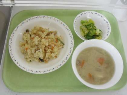 山菜おこわ 牛乳 三平汁 野菜のゆかりかけ