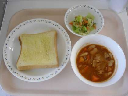 ガーリックトースト 牛乳 ポークビーンズ ゆで野菜のドレッシングかけ