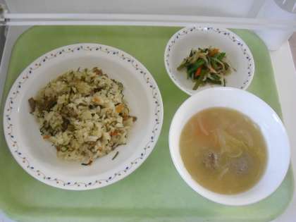 豚肉とごぼうのごはん 牛乳 いわしのつみれ汁 茎わかめ入りおひたし