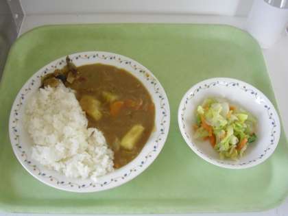 カレーライス 牛乳 福神漬け 春キャベツサラダ