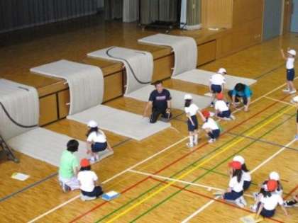本日体育館にて全校体力テストを行いました。行った項目は、上体起こし、反復横跳び、立ち幅跳びの3種類です。1年生は6年生と、2年生は5年生とペアになって行い、3、4年生は各学年で行いました。