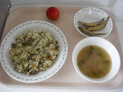 豚肉とごぼうのごはん 牛乳 あおさのみそ汁 ちかのから揚げ プラム