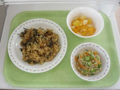 今日は七夕メニューです。おひたしは、春雨を天の川に見立て、そこにおくらの星が流れます。また、土用の丑の日にはちょっと早いですが、うなぎの入ったひつまぶし風です。うなぎパワーで、夏バテにならないようにしましょう。
