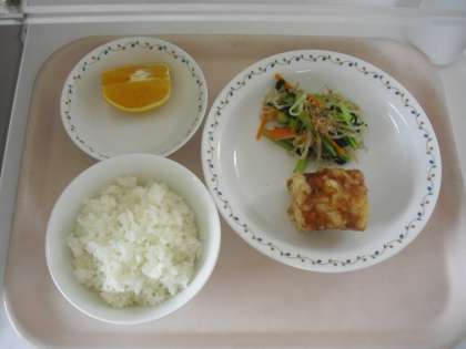 ごはん 牛乳 太刀魚の梅肉ソースかけ 野菜のおかかじょうゆかけ バレンシアオレンジ
