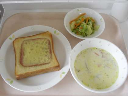 ハムチーズトースト 牛乳 ポテトスープ ゆで野菜のカレードレッシングかけ