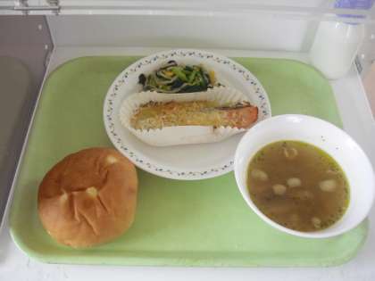 パインパン 牛乳 鮭のガーリック焼き 小松菜とコーンのサラダ きのこスープ