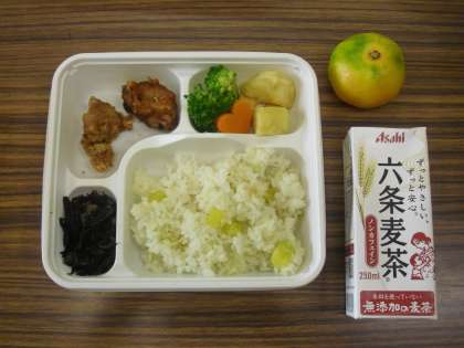 写真は、作っているときの様子とお弁当の中身です。お弁当は低学年と高学年で量がちがいます。