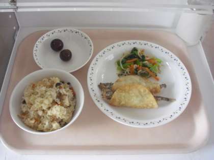 しめじごはん 牛乳 ししゃものパリパリあげ 野菜のからししょうゆかけ 巨峰
