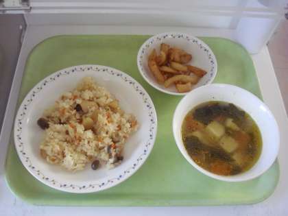 ほたてときのこのピラフ 牛乳 わかめスープ スパイシーポテト