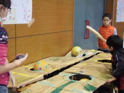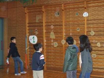縦割り班ごとに工夫したお店がずらり。店番の子も遊ぶ子もみんな楽しそうです。