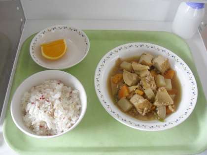 にんじん(徳島県)、しょうが(高知県)、玉ねぎ(北海道)、きぬさや(鹿児島県)、清見オレンジ(和歌山県)、いちご(1−2セレクト給食)(茨城県)、豚ひき肉(群馬県)、じゃこ(タイ)、厚揚げの大豆(カナダ)、米(岡山県)