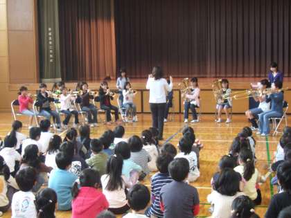 先日の音楽朝会では、夏休みのチャレンジスクールから発足した金管バンドの発表会がありました。