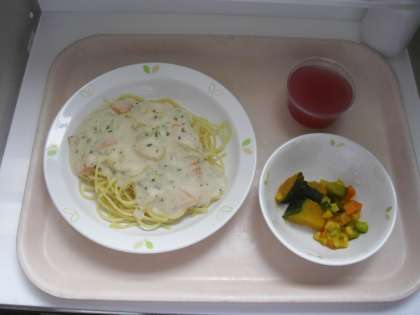 たらこクリームスパゲッティ 牛乳 かぼちゃサラダ クランベリーゼリー