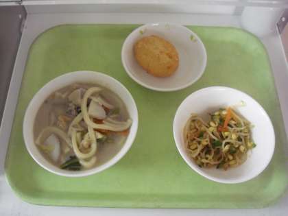 みそ煮込みうどん 牛乳 じゃがもち 豆もやしのコチュジャンがけ