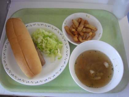 毎月19日は食育の日です。今月は自分でパンにキャベツとウインナーをはさみ、上にケチャップをかけるセルフウインナーサンドです。自分で作った給食は、いつも以上に美味しかったのではないでしょうか。