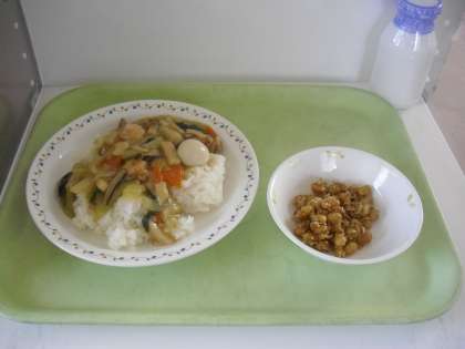 中華丼 牛乳 大豆とじゃこの甘辛揚げ