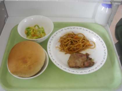 ショートニングパン 牛乳 鶏肉のハーブ焼き スパゲッティソテー コーンサラダ