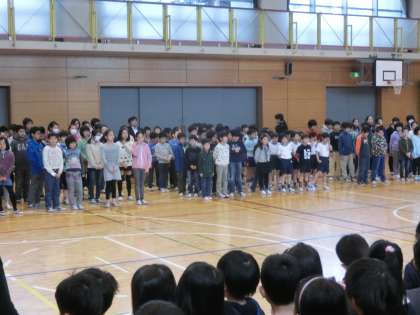 今朝の全校朝会では、明日の1年生を迎える会の呼びかけと校歌の練習をしました。