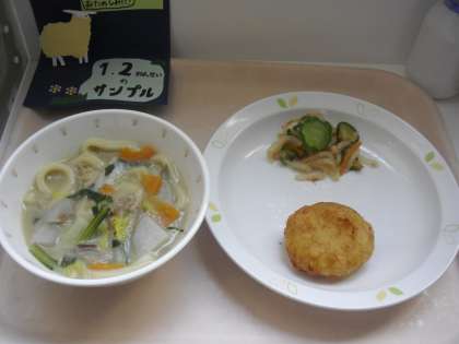 にんじん(徳島県)、ごぼう・里芋・ねぎ(埼玉県)、白菜(茨城県)、小松菜(東京都)、きゅうり(群馬県)、大根(神奈川県)、じゃがいも(鹿児島県)、豚肉(千葉県)、今年度の冷凍うどんの小麦(北海道)