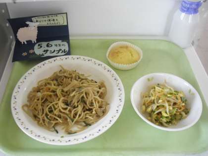 塩焼きそば 牛乳 豆もやしのコチュジャンがけ キャロットケーキ