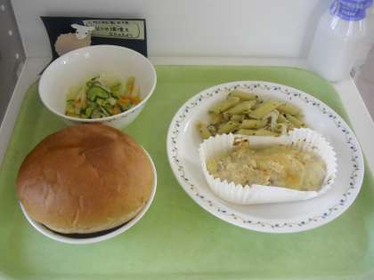 黒砂糖パン 牛乳 魚のマヨネーズ焼き バジルのペンネ フレンチサラダ