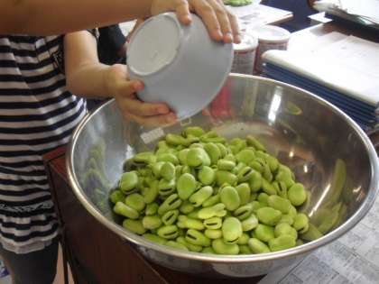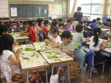 今日は2年生が空豆のさやむきをしました。約1000粒の空豆を、さやから出してくれました。「さやの中がふわふわ!」「おいしそう!」「においが、苦手かも・・・」など、観察しながら、さやむきができました。