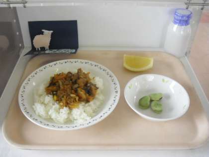 夏野菜の豚キムチ丼 牛乳 ゆで空豆 河内晩柑
