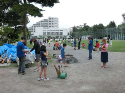 朝早くから子どもたちは元気でした。自分たちでテントの片付け、校庭の清掃、各種用具の片付けもしっかり行うことができました。閉会式では、「カレーライスがおいしかった」「肝試しが怖かった」「来年はもっとこうしてほしい」など、子どもたちの感想が出されました。最後に感謝の挨拶をして解散しました。88会のお父さんお母さん方の綿密な計画とてきぱきと働く姿から子どもたちは学ぶことも多かったと思います。天気にも恵まれ(雨が降る前に解散)大成功の「学校へ泊まろう会」でした。