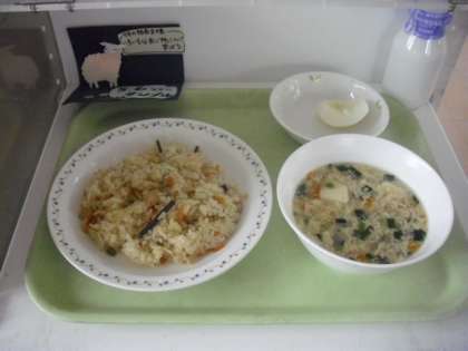 山菜おこわ 牛乳 にらたまスープ 梨