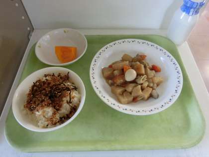 ごはん かみかみ佃煮 牛乳 いかと大根のうま煮 柿