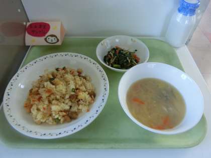 大豆入りとりめし 牛乳 いわしのつみれ汁 小松菜の乾物あえ