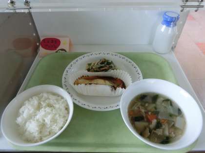 ごはん 牛乳 魚のみぞマヨネーズ焼き 和風サラダ のっぺい汁
