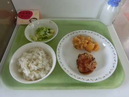 麦ごはん 牛乳 ごぼうとひじきのつくねバーグ じゃがいもの甘辛煮 ひとしお野菜