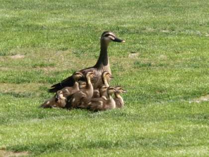 今日帰り際に、子どもたちが、校庭の芝生の周りに集まっていました。駆けつけると、何と、カモの親子が芝生にやってきたのです。警察の方がいっしょにやってきたので、お話を聞くと、お隣の世田谷公園の噴水池にいるカモの親子が、道路を歩いて本校にやってきたというのです。珍しいお客様に、子どもたちは大喜びでした。