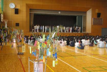 7月6日(金)本日の朝から体育館で「七夕集会」が行われました。はじめに池尻小学校で育った笹に願い事や飾りをつけました。その後の集会で、各クラスの願い事を発表したり、集会委員会の劇を見たりしました。楽しい時間が過ごせました。明日晴れるといいですね。