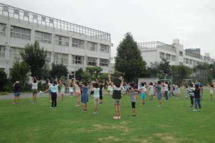 28日(火)の朝8時に池尻小学校の校庭でラジオ体操を行いました。31日(金)まで行いますので、学校に来てみんなと体操をしましょう。