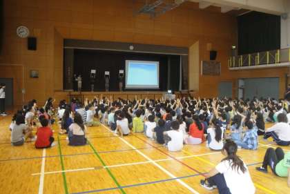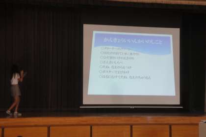 10月10日(水)本日の発表集会は、環境委員会からでした。環境委員会の仕事を分かりやすくパソコンを使って説明し、クイズも取り入れて発表していました。