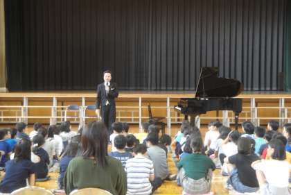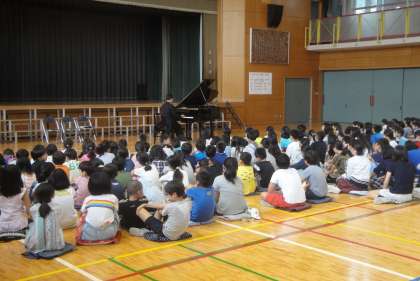 10月11日(木)本日の3・4校時に「ピアノレクチャーコンサート」がありました。3年・4年・5年の児童と保護者の方が体育館に集まり、ピアニストの竹内英仁先生のお話を聞きながらのピアノコンサートでした。作曲者のことや曲のことを分かりやすく説明しながらのコンサートでした。