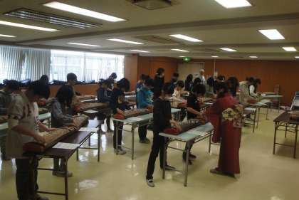 12月11日(火)5年生がお琴に挑戦する「お琴教室」がありました。各クラス2時間ずつのお稽古でした。子供にとってとても扱いやすい小型のお琴を一人に一台用意してもらい「さくらさくら」を演奏しました。子どもたちは、短い時間でしたが、教えてもらった通りに上手に演奏していました。びっくりです。