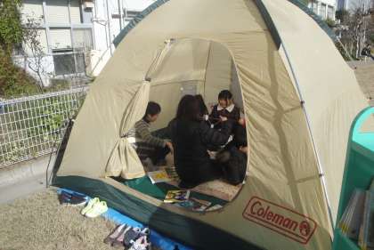 12月15日(土)青空おはなし会がありました。とても風が冷たく寒い日でしたが、お日様が出ていました。校庭の赤松の木のそばにテントを張りその中での「おはなし会」でした。中に電気マットを敷いたので暖かいし、テントの中なので風もありません。最後に「ぶんぶんごま」をやって終わりました。とてもほっこりしました。