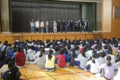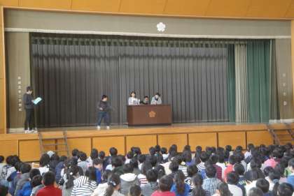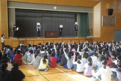2月20日(水)本日の集会は、図書委員会の発表でした。図書委員会では、本の扱い方を寸劇にしたり、図書室に関するクイズを出したりと、分かりやすく発表していました。これからもたくさん本を読んでくださいね。