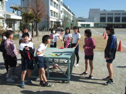 活動が終わったあと、いつも朝礼台に集まって振り返りをしています。