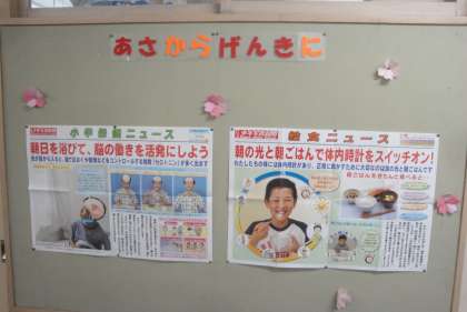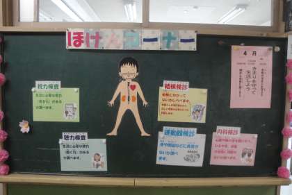 保健室の廊下の掲示板に、ほけんコーナーがあり、隣には今月の掲示「あさからげんきに」があります。学校にお越しの際には是非ご覧下さい。