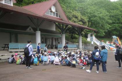 4月25日(木)3・4年生は「こどもの国」へ遠足に行きました。こどもの国に着いた時には少し霧雨がありましたが、その後、雨は降らず、青空も顔を出してきました。こいのぼりの前で写真を撮って、縦割り班での行動です。