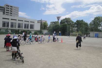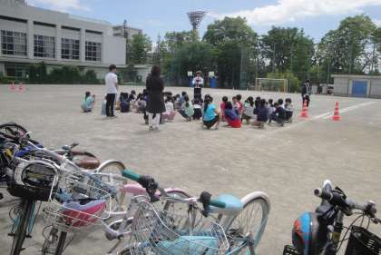 5月7日(火)3校時に、3年生の自転車による交通安全教室がありました。おまわりさんの話を聞いて、校庭に書かれた道路を自転車で上手に運転していました。保護者の方にもご協力をいただきました。
